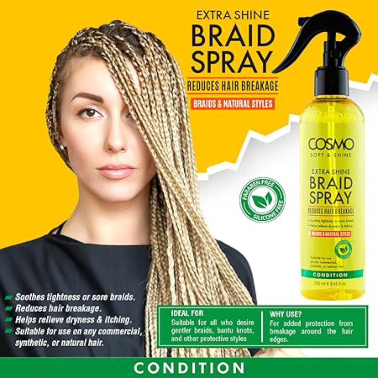 اگر به دنبال محصولی متفاوت هستید که زیبایی بافت موهای شما را چند برابر کند و همزمان درخششی طبیعی، سالم و جذاب به موهایتان بدهد، Cosmo Soft & Shine Extra Shine Braid Spray دقیقاً همان چیزی است که لازم دارید!