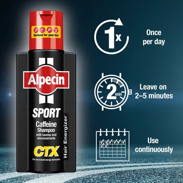 شامپو کافئین آلپسین اسپرت CTX ساخت آلمان بوده و علاوه بر شستشوی موها باعث تقویت، افزایش انرژی ریشه مو و جلوگیری از ریزش مو میشود. شامپو سی تی ایکس آلپسین با تسریع روند رشد مو و افزایش استحکام و ضخامت موها مناسب مردانی است که فعالیت های سنگین ورزشی دارند. این افراد به علت مصرف انرژی بالا، مستعد ریزش مو هستند. در حین تمرین با شدت بالا، ماهیچه ها انرژی زیادی مصرف میکنند و بدن انرژی را در جاهای دیگر، به عنوان مثال در ریشه مو، مصرف میکند. ریزش مو می تواند نتیجه این امر باشد، زیرا ریشه مو خود عضوی با مصرف انرژی بالاست. شامپو آلپسین CTX حاوی کافئین، تورین، بیوتین، روی، منیزیم و کلسیم بوده و با افزایش انرژی ریشه مو و افزایش چسبندگی موها ریزش ناشی از استرس های فیزیکی و فعالیت های سنگین ورزشی را متوقف میکند. هم چنین تعریق ناشی از فعالیت های بدنی پوست کف سر را چرب کرده و محیط مناسبی برای رشد قارچ ها مهیا میکند. شامپو Sport Caffeine CTX آلپسین با پاکسازی عمیق پوست سر و کنترل ترشح چربی از گسترش قارچ ها جلوگیری کرده و از ریزش جلوگیری میکند.
