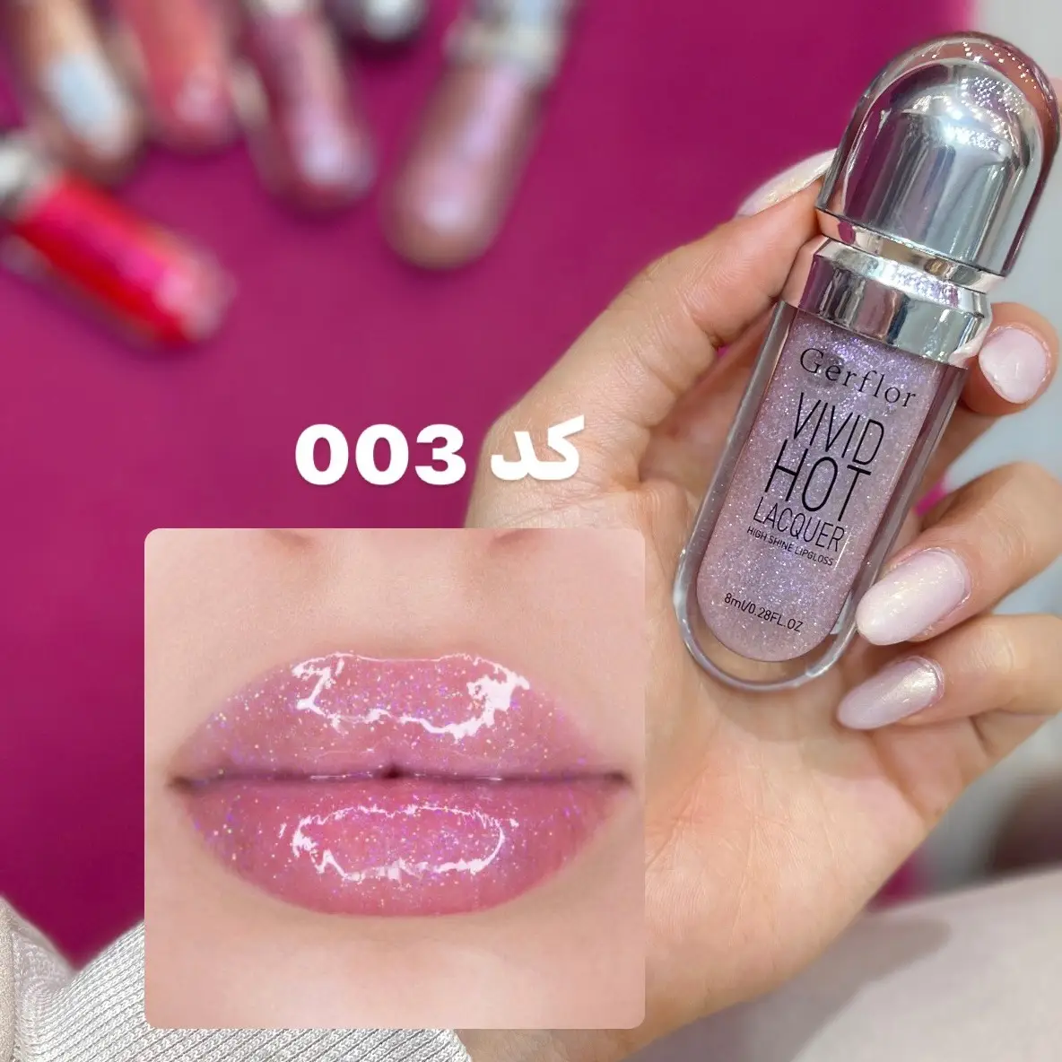 💡 ترکیب لیپ گلاس شاین شماره ۰۰۳ گرفلور با رژلب نود یا صورتی روشن، جلوهای لطیف، طبیعی و درخشان ایجاد میکند.
