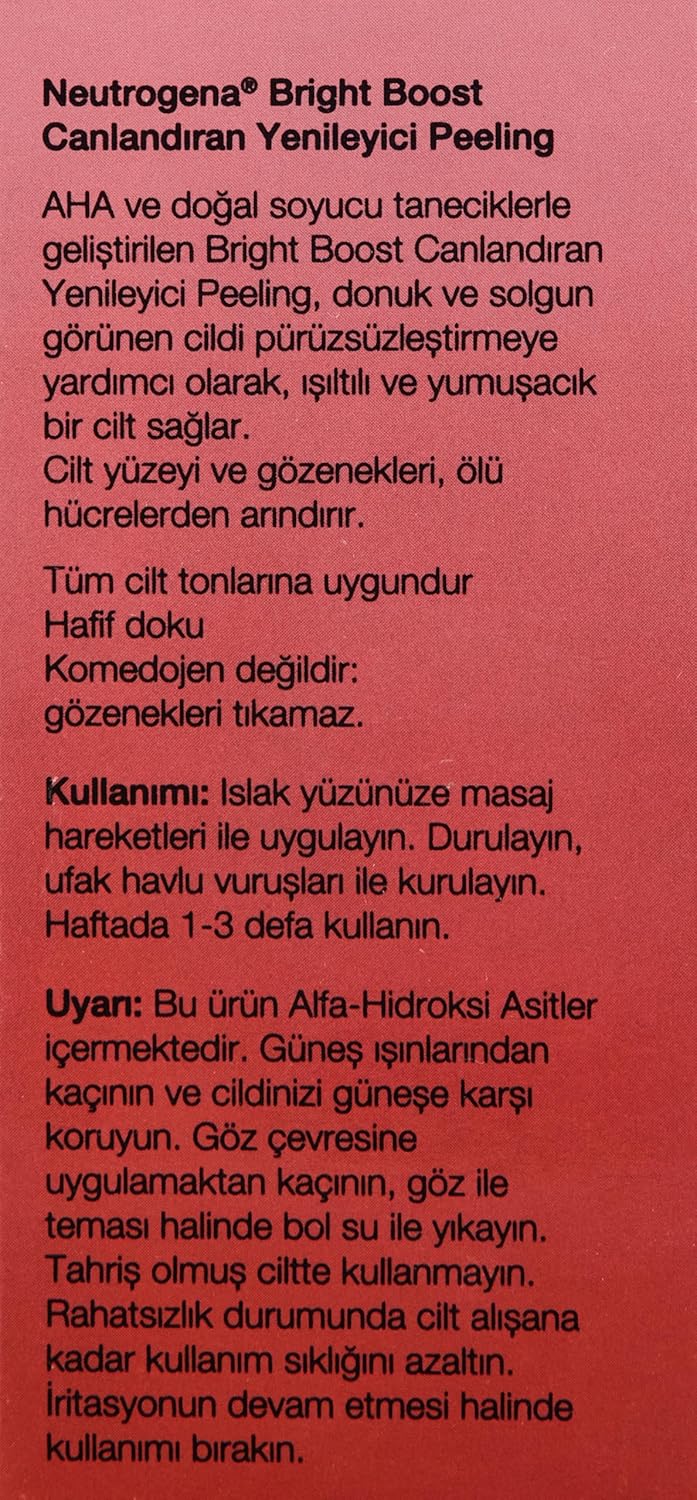کرم لایه‌بردار و روشن‌کننده Neutrogena Bright Boost با فرمولی پیشرفته و ملایم، سلول‌های مرده سطح پوست را حذف کرده و موجب بازسازی و درخشش طبیعی پوست می‌شود. این محصول حاوی ترکیبات فعال و آنتی‌اکسیدانی مانند AHA، PHA و ماندلیک اسید است که بدون تحریک پوست، آن را صاف، نرم و یکنواخت می‌سازد.