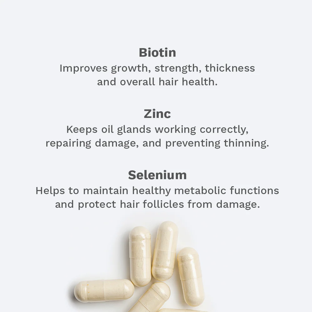 ترکیبات اصلی شامل بیوتین، سلنیوم، زینک، ویتامینهای گروه B، ویتامین D، MSM و کلاژن هیدرولیزشده است که به رشد مو کمک کرده و همزمان به سلامت پوست و ناخنها نیز سود میرسانند. مصرف مداوم این مکمل، موهایی سالمتر، بلندتر و قویتر برای بانوان به همراه خواهد داشت.