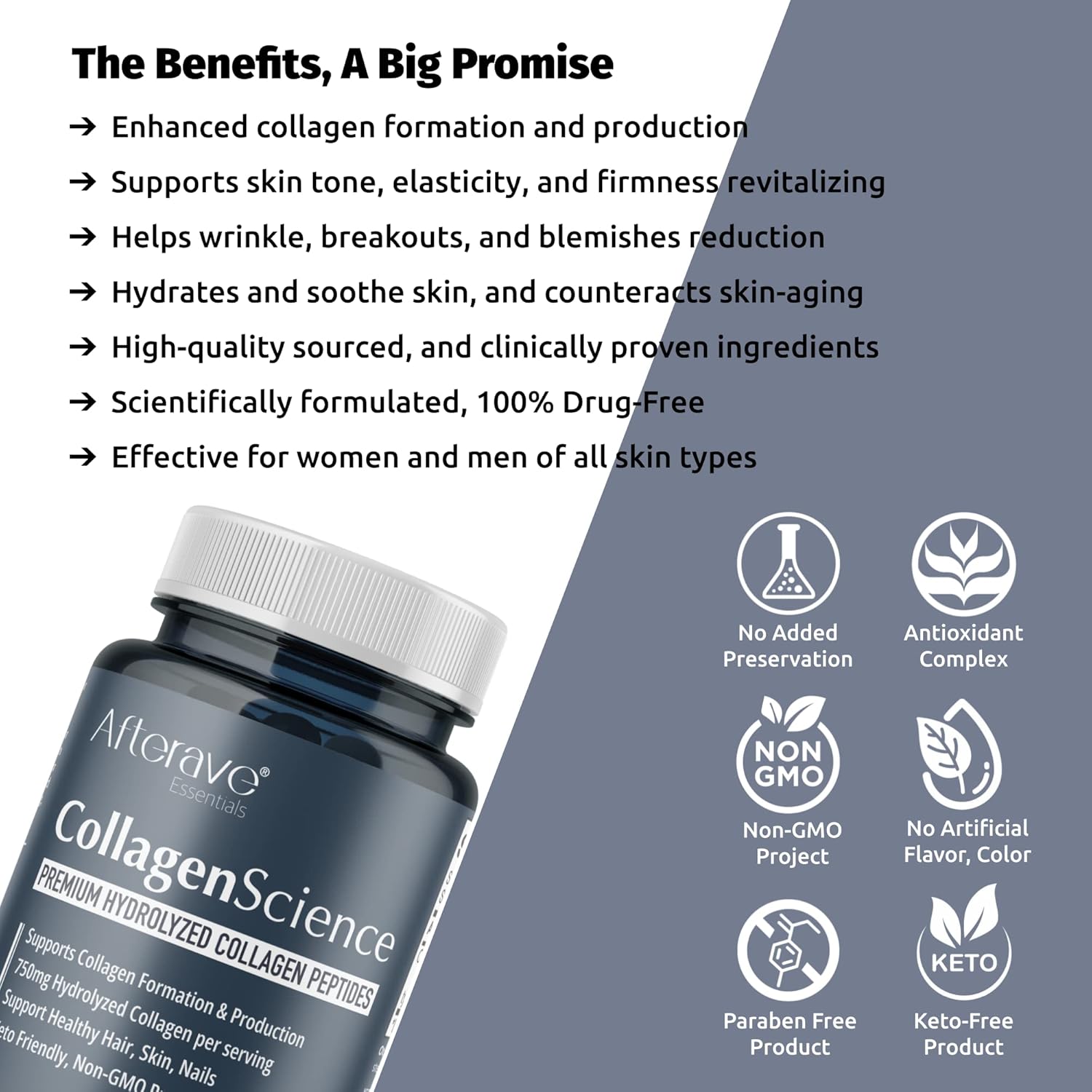 Collagen Science Afterave یک مکمل تخصصی کلاژن در قالب کپسول است که بهطور ویژه برای مراقبت از پوست، مو، ناخن و مفاصل طراحی شده است. این محصول با پپتیدهای کلاژن هیدرولیز شده غنی شده و به بازسازی ساختار پوست کمک میکند، علائم پیری را کاهش میدهد و با تقویت فولیکولهای مو از ریزش مو پیشگیری میکند. همچنین سلامت مفاصل و استخوانها را حفظ کرده و تولید طبیعی کلاژن بدن را افزایش میدهد.